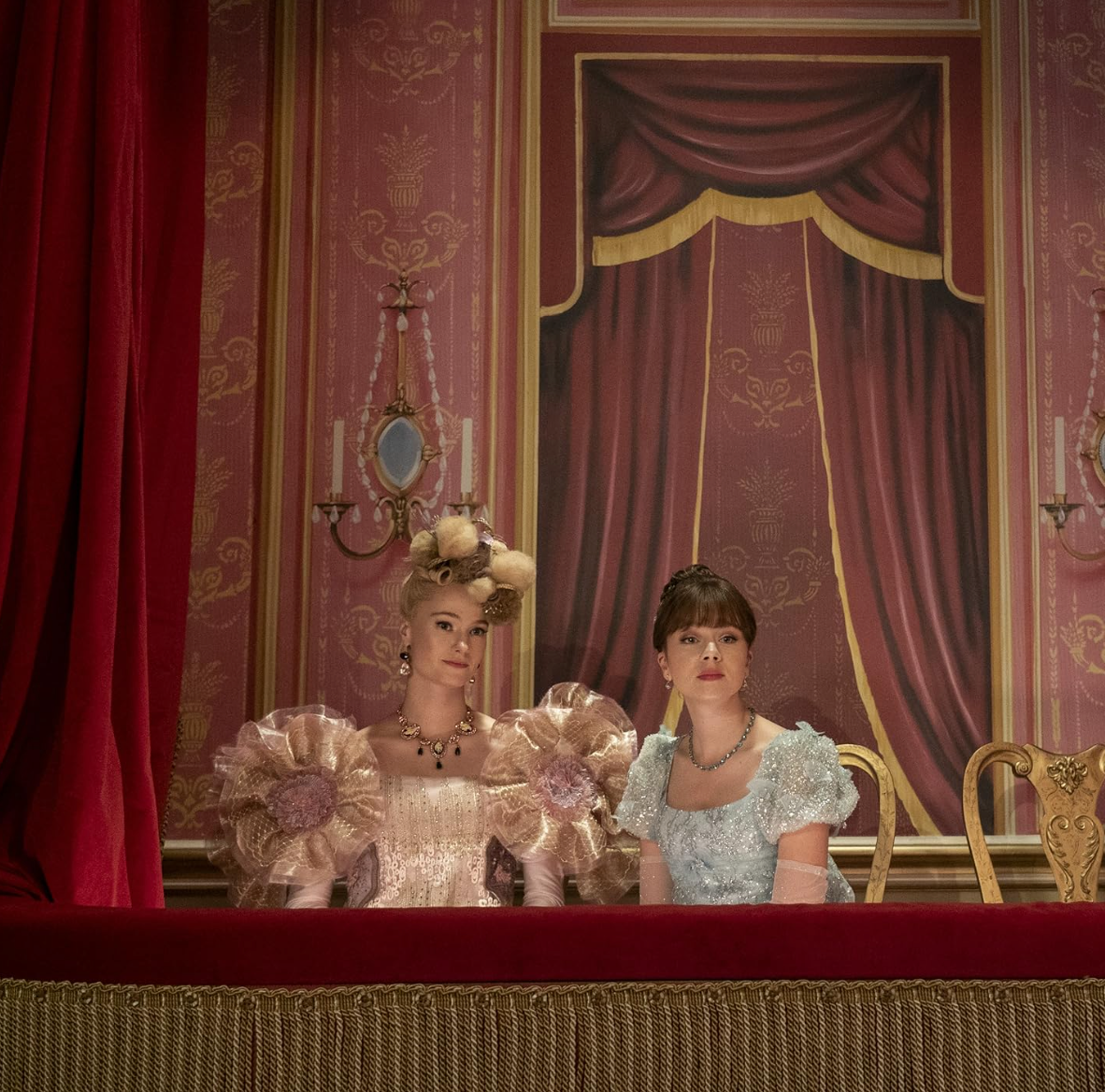 This is costume and set design working in harmony. Walls, gowns, flowers, and wallpaper echo one another. The aesthetic becomes immersive.